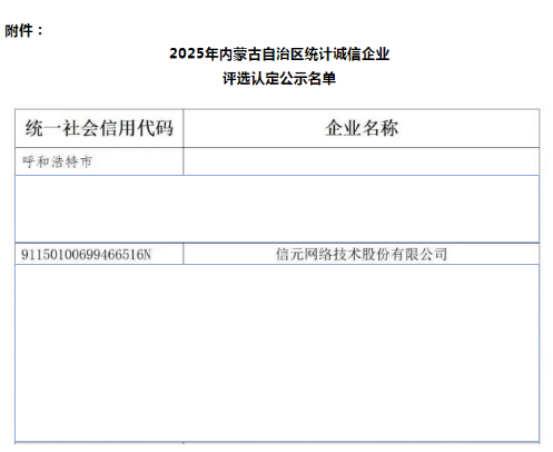 近日,內蒙古自治區統計局按照《內蒙古自治區統計誠信企業認定方案》開展了“2025年統計誠信企業”認定工作,信元網絡技術股份有限公司榮登榜單。這份自治區級的榮譽,不僅是對信元網絡的認可,更是對公司多年來誠信履約、勇于承擔社會責任的最佳褒獎。
